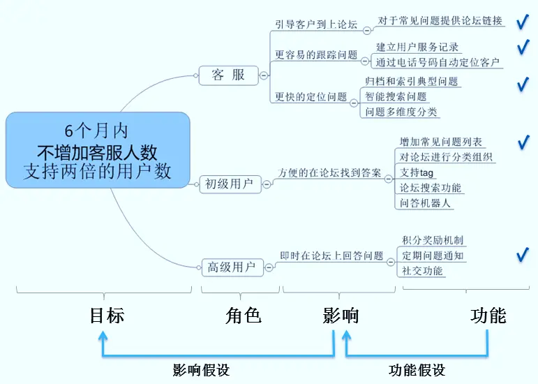 从这张地图可以看出,目标、角色、影响都是从使用者的角度来进行定义的,而功能则是从系统提供者的角度来进行定义的。这样就在用户价值和系统功能之间进行了映射,明确了用户价值的实现依赖,并为开发实现功能给出了明确的价值定义,确保了团队对用户价值和功能的一致认可,避免了沟通上的浪费。