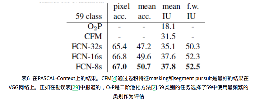 我们将我们的FCN用于语义分割进行了更进一步的评估。PASCAL-Context [29] 提供了PASCAL VOC 2011的全部场景注释。有超过400中不同的类别,我们遵循了 [29] 定义的被引用最频繁的59种类任务。我们分别训练和评估了训练集和val集。在表6中,我们将联合对象和Convolutional