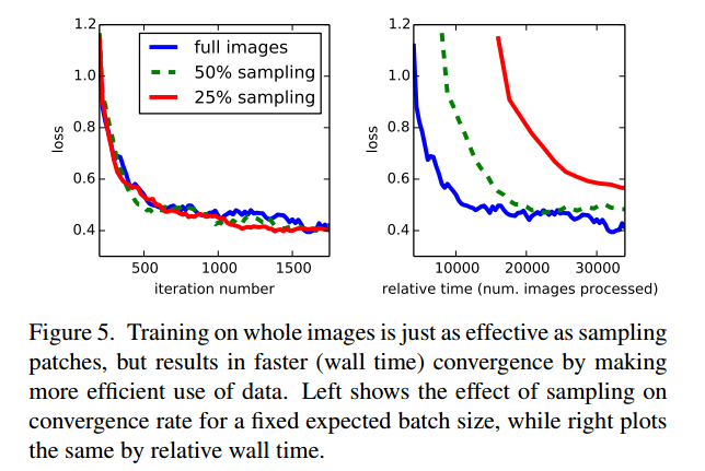 patch取样正如3.4节中解释的,我们的全图有效地训练每张图片batches到常规的、大的、重叠的patches网格。相反的,先前工作随机样本patches在一整个数据集 [30,3,9,31,11] ,可能导致更高的方差batches,可能加速收敛 [24] 。我们通过空间采样之前方式描述的损失研究这种折中,以1-p的概率做出独立选择来忽略每个最后层单元。为了避免改变有效的批次尺寸,我们同时以因子1/p增加每批次图像的数量。注意的是因为卷积的效率,在足够大的p值下,这种拒绝采样的形式依旧比patchwose训练要快(比如,根据3.1节的数量,最起码p>0.2)图5展示了这种收敛的采样的效果。我们发现采样在收敛速率上没有很显著的效果相对于全图式训练,但是由于每个每个批次都需要大量的图像,很明显的需要花费更多的时间。