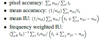 度量 我们从常见的语义分割和场景解析评估中提出四种度量,它们在像素准确率和在联合的区域交叉上是不同的。令n_ij为类别i的被预测为类别j的像素数量,有n_ij个不同的类别,令