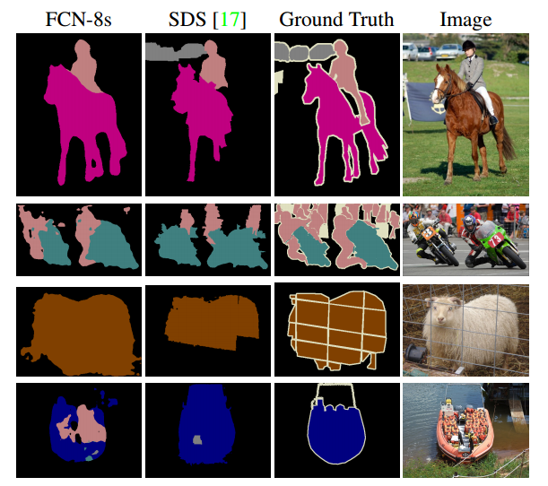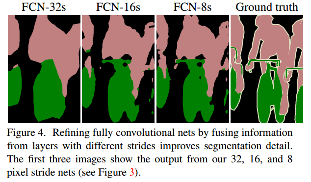 我们继续融合pool3和一个融合了pool4和conv7的2×上采样预测,建立了FCN-8s的网络结构。在平均IU上我们获得了一个较小的附加提升到62.7,然后发现了一个在平滑度和输出细节上的轻微提高。这时我们的融合提高已经得到了一个衰减回馈,既在强调了大规模正确的IU度量的层面上,也在提升显著度上得到反映,如图4所示,所以即使是更低层我们也不需要继续融合。