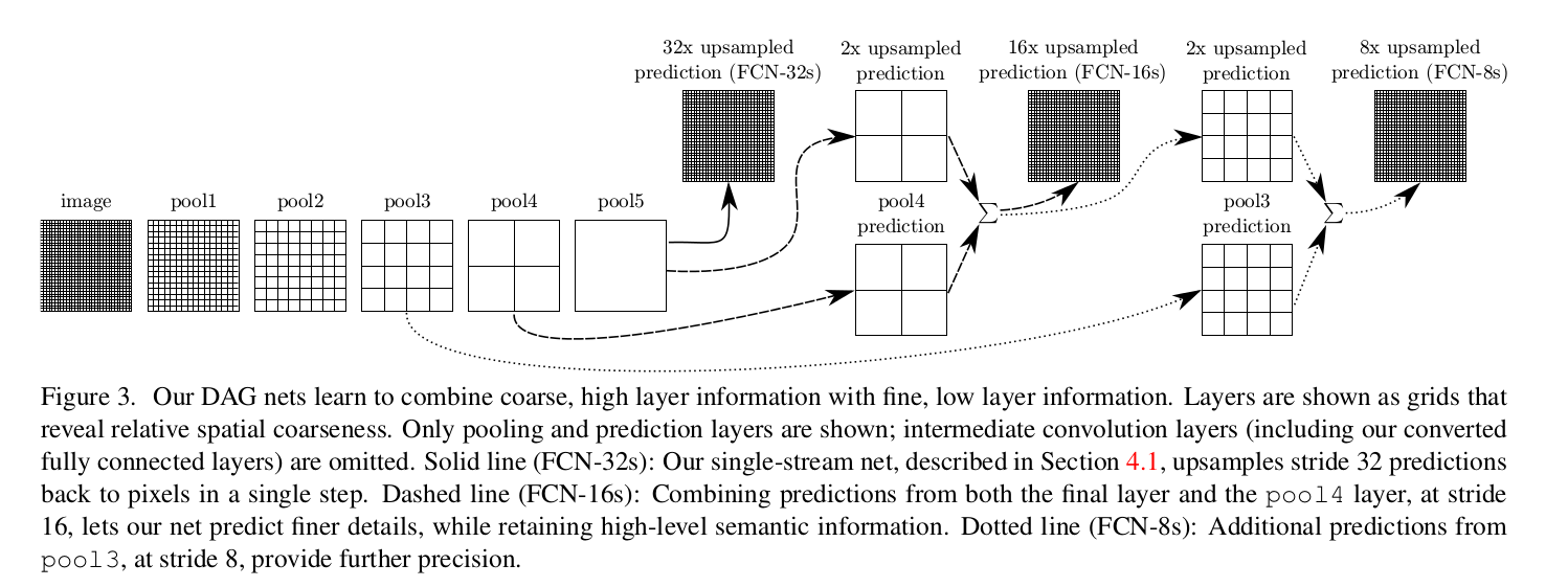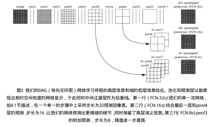 我们定义了一个新的全卷积网用于结合了特征层级的分割并提高了输出的空间精度,见图3。当全卷积分类能被微调用于分割如4.1节所示,甚至在标准度量上得分更高,它们的输出不是很粗糙(见图4)。最后预测层的32像素步长限制了上采样输入的细节的尺寸。