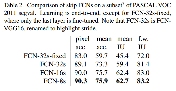 为此,我们训练和在PASCAL VOC 2011分割挑战赛[8]中验证。我们训练逐像素的多项式逻辑损失和验证标准度量的在集合中平均像素交集还有基于所有分类上的平均接收,包括背景。这个训练忽略了那些在groud truth中被遮盖的像素(模糊不清或者很难辨认)。