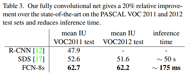 PASCAL VOC 表3给出了我们的FCN-8s的在PASCAL VOC2011和2012测试集上的表现,然后将它和之前的先进方法SDS[17]和著名的R-CNN[12]进行比较。我们在平均IU上取得了最好的结果相对提升了20%。推理时间被降低了114×(只有卷积网,没有proposals和微调)或者286×(全部都有)。