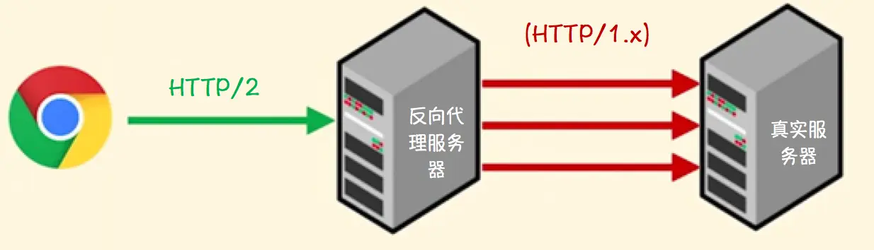 反向代理服务器位于客户端和真正的服务器之间,用于对高并发访问的服务器进行负载均衡。在这种情况下头阻塞主要发生在客户端和代理服务器之间的通信,因此在代理服务器中支持HTTP/2可以消除大部分头阻塞带来的性能问题。而代理服务器和真正的服务器之间仍然采用HTTP/1.x进行通信。