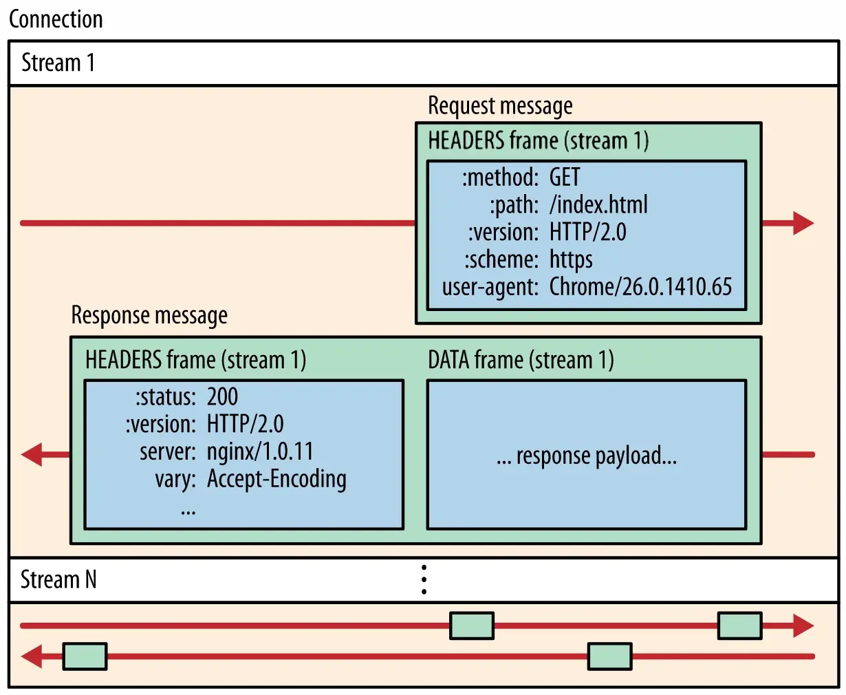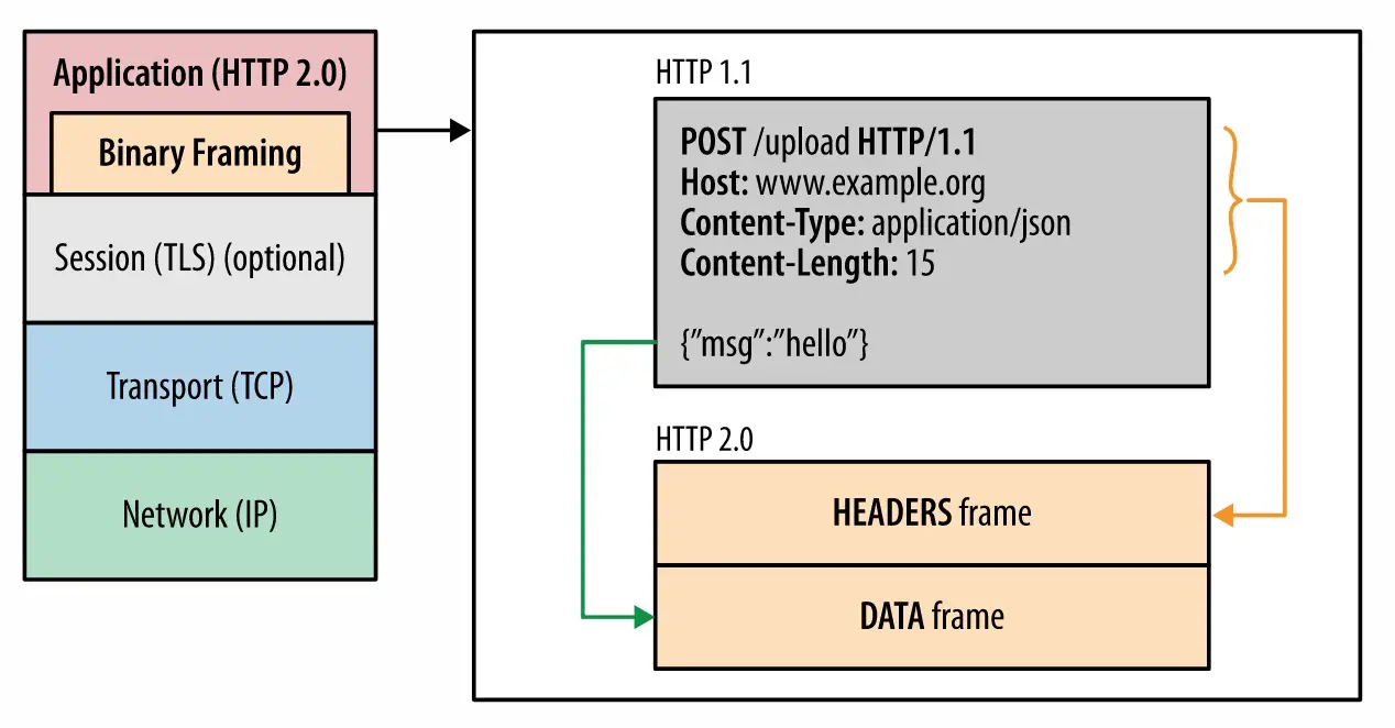 与HTTP/1.x采用ASCII码明文传输的方式不同,HTTP/2在服务器和客户端之间采用传输效率更高的二进制的形式。值得一提的是,HTTP/2中报文二进制帧被分为头部帧(Header Frame)和数据帧(Data Frame),这主要是因为HTTP/2为头部字段单独提供了一种压缩方式,可以使网络中传输的头部数据降低到最小(见下一节)。 在HTTP/2中,所有数据的传输可以分为连接(Connection)、流(Stream)和帧(Frame)三个层次。与HTTP/1.1中采用的并行连接不同,HTTP/2在客户端和服务器的整个会话都会复用一条连接。在这个连接中一组完整地请求、响应被称为流。流中的每段数据(头部、数据段)被称为帧。帧是HTTP/2中通信的最小单位,其中包含了其属于那条流的“身份”信息。