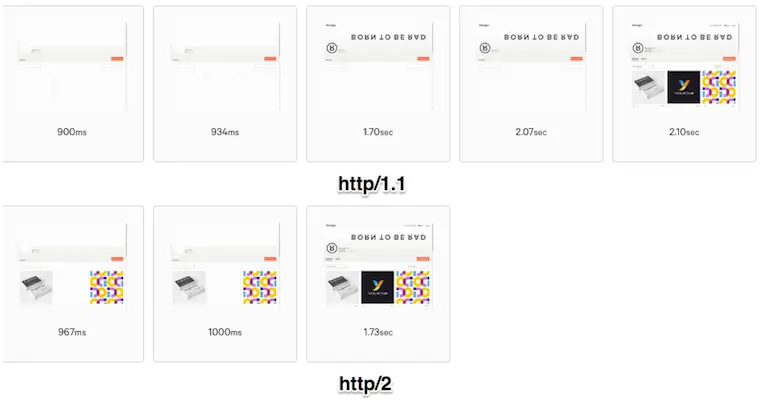 - 在带宽和延时均受限的场景中,升级后的页面视觉呈现速度会进一步下降,甚至会达到25%以上(下面第一个图为http/1.1,第二个图为HTTP/2)