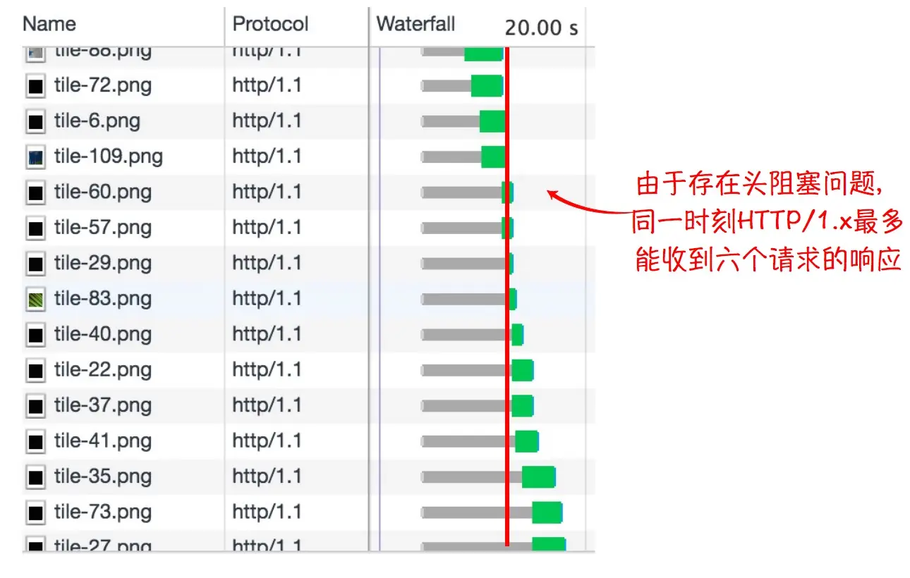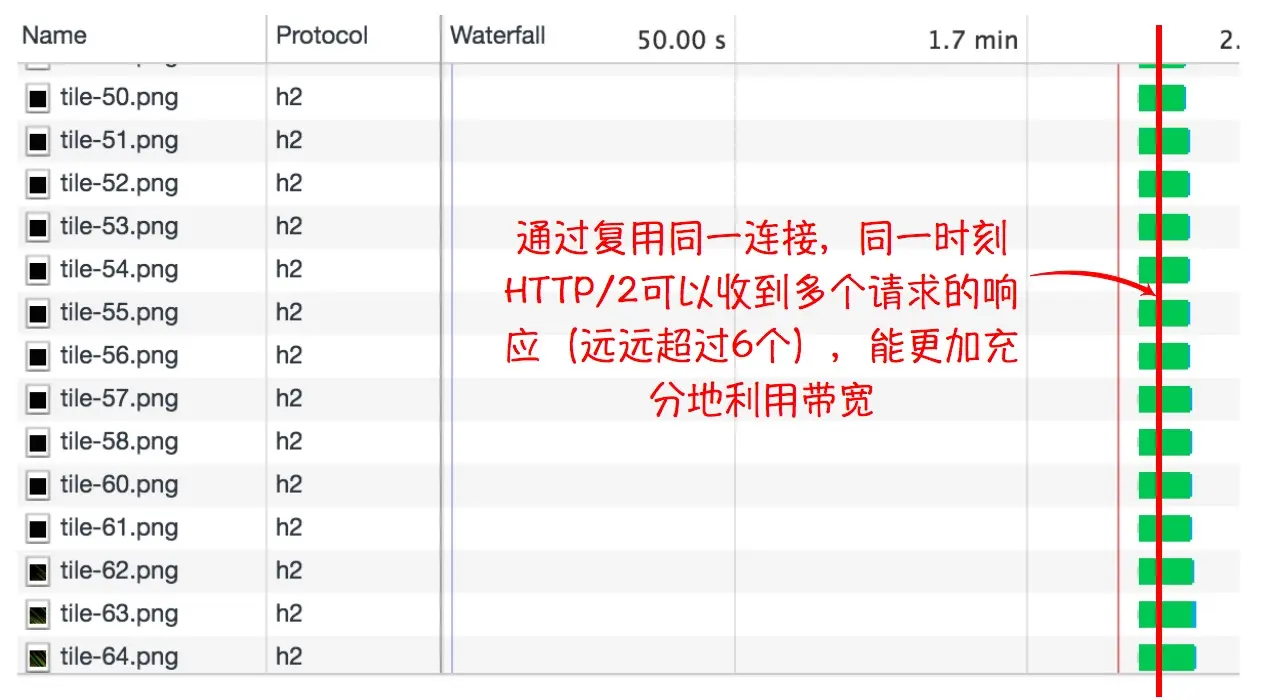 Akamai公司给出了一个测试页面用于对比在存在大量请求情况下HTTP/2与HTTP/1.x之间巨大的性能的差异。通过查看HTTP/2请求与HTTP/1.x请求的瀑布流可以发现,HTTP/1.x连接存在严重的头阻塞问题,每个时刻最多只可能有6条请求在6条连接上执行,而HTTP/2采用多条请求复用一个连接的机制,同一时刻可以接收到的请求数不受连接数的限制,能更加充分地利用网络带宽。在笔者的网络环境下,后者可以将加载同样资源的时间降低50倍。虽然这是一个比较极端的案例,但HTTP/2带来的性能提升可见一斑。