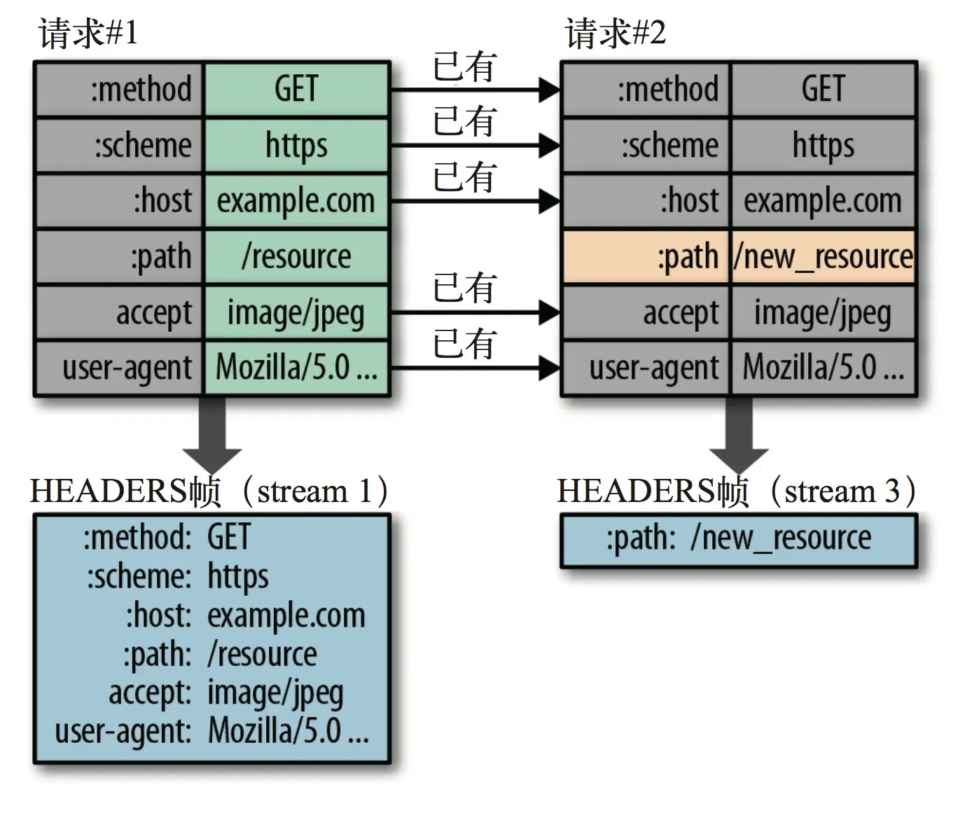 前面已经提到,HTTP/1.x会在请求和响应中中重复地携带不常改变的、冗长的头部数据,给网络带来不必要地负担。HTTP/2除了将ASCII明文转化为二进制帧以提高网络传输的有效性外,还提出了一种专门针对报文头部数据进行压缩的方案——Hpack。其主要思想是,通过重用当前连接中之前发送请求中的头部,仅发送新加或更改的头部信息,以降低报文中头部字段大小。头部压缩的过程如下图所示: