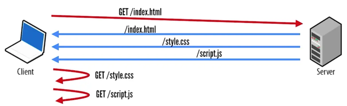 简单来讲,Server Push就是允许Server对还没有发出的请求进行响应。如下图所示,在第一个请求中,客户端发出了一条对index.html的请求。通过对index.html的分析,服务器可以推测出其该html的加载还需要style.css和script.js,因此在第一条请求的响应中可以将这些内容一并发送过去,避免了接下来两条请求、响应带来的延迟(RTT, Round-trip Time)。虽然在HTTP/1.x中采用inline的方式,也可以达到类似Server Push的效果,但inline具有以下弊端: