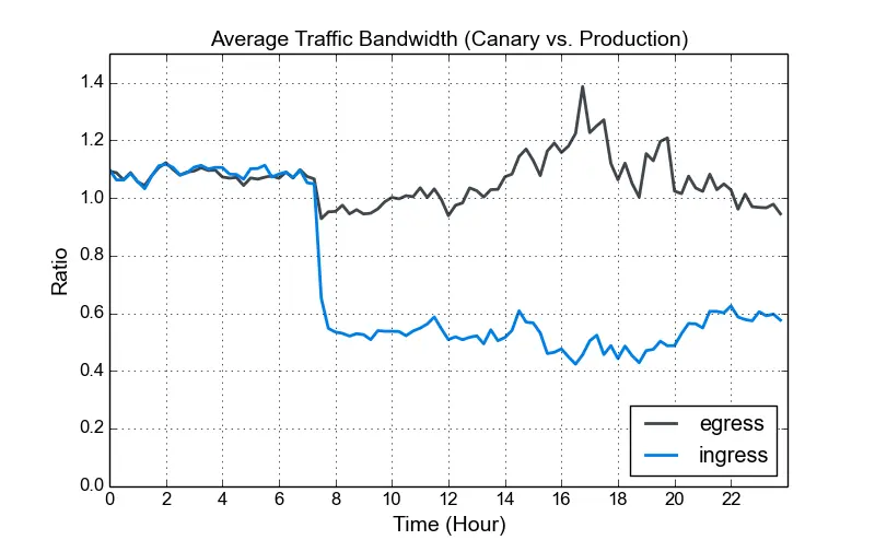 Dropbox提供了其Web服务器从SPDY升级到HTTP/2(Niginx 1.9.15)的过程及分析。下图给出其在升级过程中,SPDY连接和HTTP/2连接的占比情况,可以看到起其升级过程是在多个服务器中逐步完成的,这给我们对比升级前后的性能提供了很好地素材。 下图给出了在升级过程中,请求(ingress)和响应(egress)所占据网络带宽相对于升级前平均值的比。可以看到在切换后,请求所占据网络带宽有了较大幅度的下降(约为原来的一半),这主要是由HTTP/2的头部压缩带来的(虽然SPDY也提供了头部压缩的特性,但由于存在安全问题,通常都不会启用)。而响应占据的网络资源没有太大变化,这主要是因为头部数据在响应中仅占很小一部分。