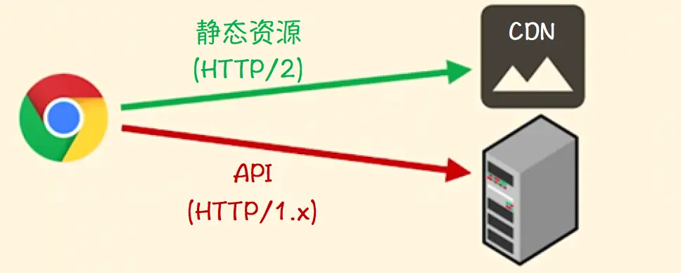 通常情况下,一个网站中绝大多数的请求是针对静态资源发起的,因此将静态资源部署到支持HTTP/2的CDN上是一种最方便快捷的升级方法。在这种情况下访问静态资源的请求通过HTTP/2完成,而API访问则通过HTTP/1.x完成。这种方法虽然比较便捷,但由于对服务端HTTP/2的支持失去控制,往往难以充分利用所有已经实现的新特性(如Server Push、优先级控制等)。