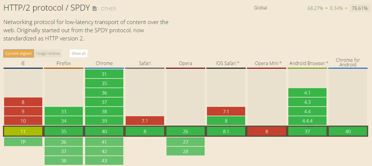 在升级之前首先要确认你当前使用的客户端(浏览器)和服务器均支持了HTTP/2。幸运的是,迄今为止绝大多数浏览器均已对HTTP/2会话提供了支持,目前为止主流的Web服务器最新版本已经可以支持HTTP/2(Nginx ^1.9.5, Apache ^2.4.24 mod_http2)。所以仅需要安装最新版本的服务器即可使用其提供的HTTP/2新特性。需要注意的是,在升级HTTP/2之前要确认服务器支持SSL(支持HTTPS)。HTTP/2自身并不要求必须底层支持SSL,但当服务器不支持SSL时,几乎所有的浏览器会无视HTTP/2连接。