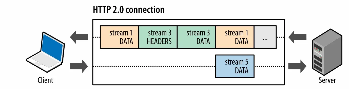 在HTTP/1.x中,通常采用维持多个连接的方式使请求和响应并行发送,因为计算和存储资源的限制,无法通过无限开启新连接(通常上限为六个)的方式彻底解决头阻塞问题。在HTTP/2中,所有的数据通信均在一个连接中完成。每个数据帧在发送端准备完成后即可发送,无需等待前一个请求的响应。数据接收端则在接到这些乱序发送的数据帧后,再根据每个帧携带的“身份”,对这些数据进行重新组装,以获得完整地请求或响应数据。HTTP/2中采用的多路复用技术彻底解决了头阻塞问题;重复利用了每一组请求、响应之间的连接的网络资源,在降低资源开销的同时,降低了数据传输延时。
