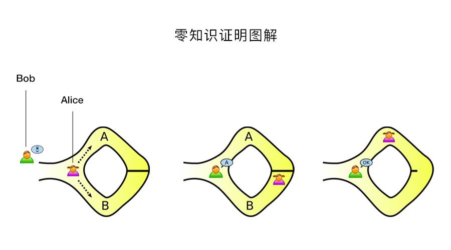 2)这是一个很经典的例子:有一个缺口的环形长廊 ,出口和入口距离非常近(在目距之内),但走廊中间某处有一道只能用钥匙打开的门,Alice 要向 Bob 证明自己拥有该门的钥匙。采用零知识证明,则 Bob 看着 Alice 从入口进入走廊,然后又从出口走出走廊,这时Bob没有得到任何关于这个钥匙的信息,但是完全可以证明Alice拥有钥匙。