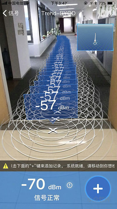 再来说回这个 AR WiFi 信号大师,往常如果想要测试家中或者无论什么地方的 Wi-Fi 覆盖情况,只能看数字,或者曲线图,一堆堆的 -xx dBm,而这次直接能看到具体位置的信号强度。