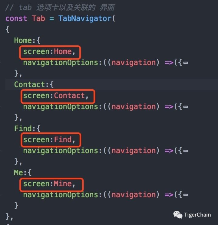 然后把各自的 tab 对应的界面配置到 TabNavigator 中,如下图红色框修改