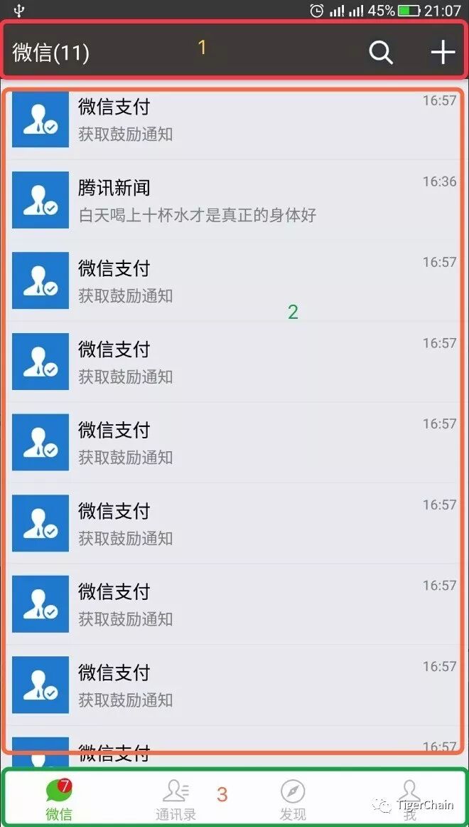 2、微信的整体框架可以分为三个部分,上部分是 TitleBar「1」,中间中内容体「2」,底部是 Tab 选项卡「3」