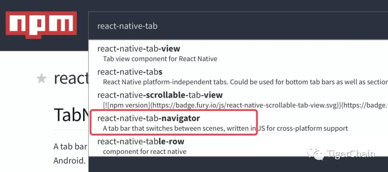 打开 npm/yarn 的官网,直接输入 react-native-tab,然后有自动提示功能,不要眨眼下面红色框框就是我们想要找的—react-native-tab-navigator
