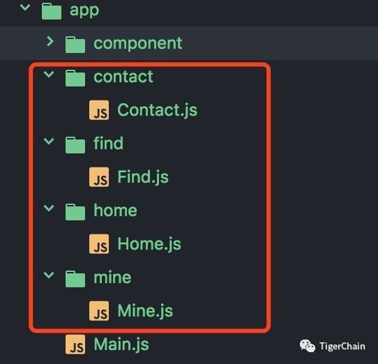 上面的代码中,通讯录、发现、我的界面,我们都使用的是 Home ,接下来我们把四个 tab 对应的组件单独创建出来 , 接下来我们把这几个界面创建出来,如下图我们新增内容「红色框中」
