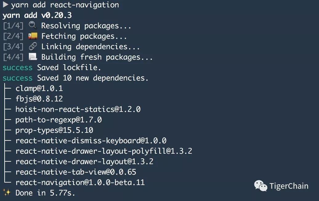 这样我就成功的安装了 React Navigation ,我们可以看到 package.json 的 dependencies 中多了 react-navigation