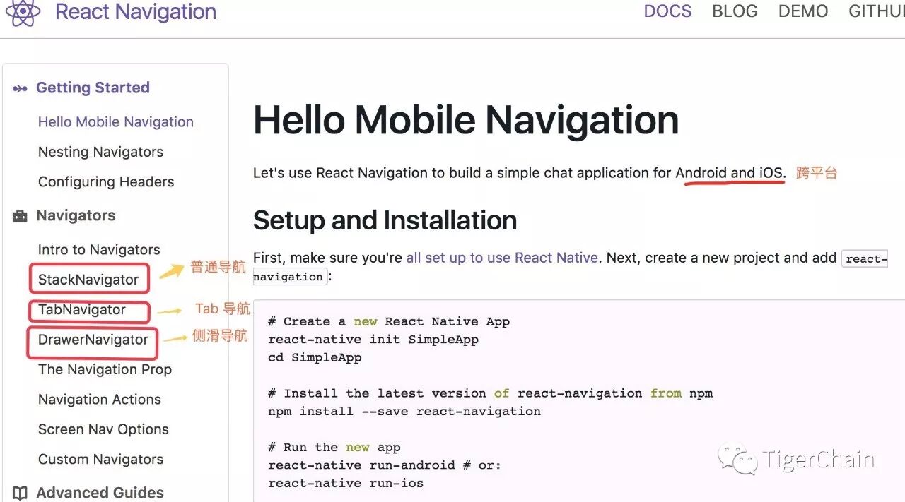 我们既然都找到了我们要的组件,那么我们就直接开始整吧!先不要急,还有没有更好的,或者更适合的组件呢?看了官方文档的 Navigation 相关内容,看官网推荐了一个 React Navigation,然后根据官网给的连接 https://reactnavigation.org/docs/intro/ 进去看了一下,我靠这个组件更爽,支持普通的导航、Tab 导航、和侧滑,简直是导航中的战斗机。下面是部分截图看一下「如果想了解更多,去官网查看」