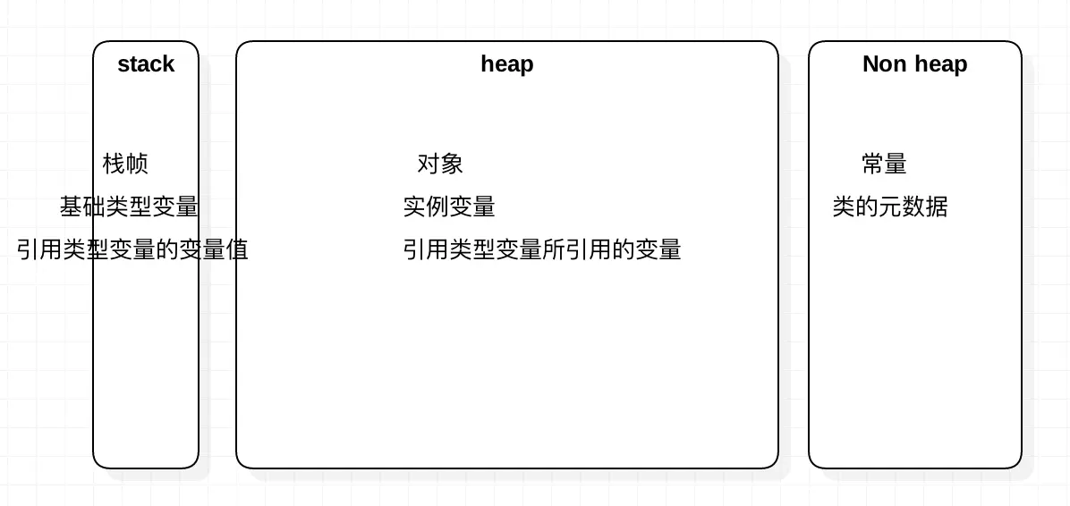 非堆空间:也是java虚拟机在启动时分配的一段可动态扩容的内存空间,用于存储常量、类的元数据(类的静态变量、类有哪些方法、方法的元数据:名称、参数、返回值等)。也是多个线程之间共享的存储空间