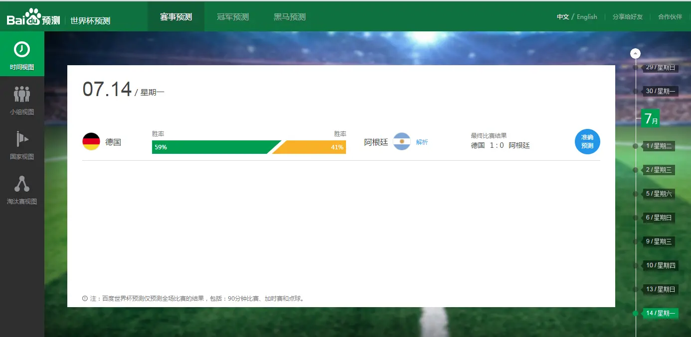 “在百度对世界杯的预测中,我们一共考虑了团队实力、主场优势、最近表现、世界杯整体表现和博彩公司的赔率等五个因素,这些数据的来源基本都是互联网,随后我们再利用一个由搜索专家设计的机器学习模型来对这些数据进行汇总和分析,进而做出预测结果。”---百度北京大数据实验室的负责人张桐
