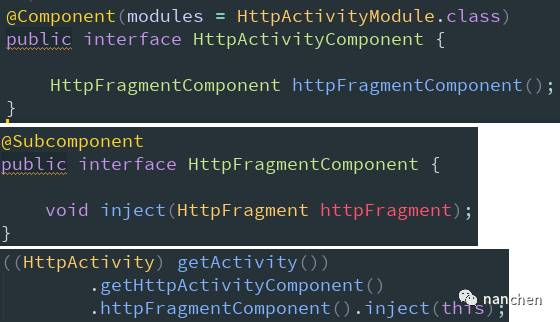 1、先定义子 Component,使用 @Subcomponent 标注(不可同时再使用 @Component);