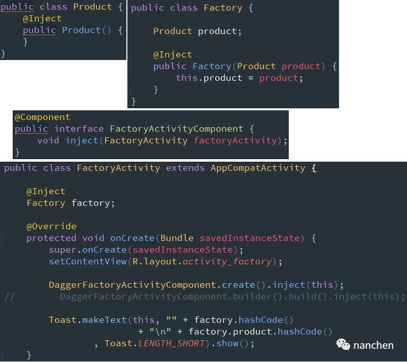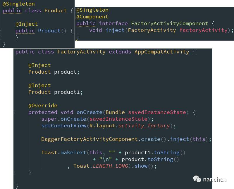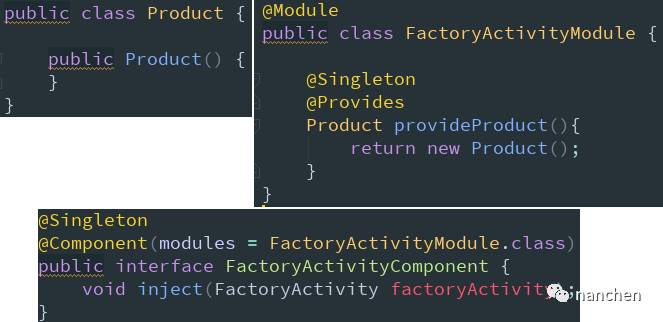 其实这个 inject 过程并不像我们的代码看上去是这种 inject 套 inject 的过程,真实过程是这样:在 FactoryActivity 中进行 inject() 的时候,发现 Factory 的构造函数被 @Inject 标注了且带有一个参数,然后 dagger2 就去寻找 Product 发现它的构造函数也被 @Inject 标注并且无参数,于是 dagger2 把 Product 的实例注入给 FactoryActivity,然后再去实例化 Factory 的时候用的是已经注入给 FactoryActivity 的那个 Product 实例。也就是说我们可以这样理解:并不是 Factory 直接实例化 Product,而是 FactoryActivity 实例化 Product 后交给 Factory 使用的。