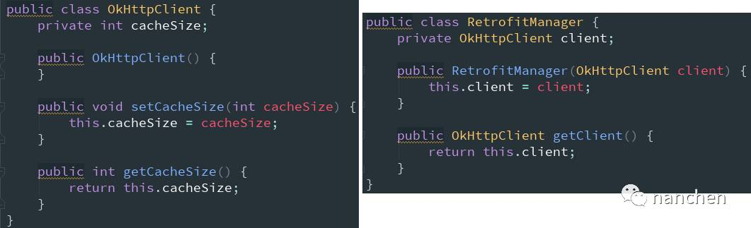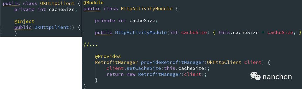 直接给构造函数添加 @Inject 标注的方式对于我们自己编写的代码肯定是没问题,但若是我们引入的第三方库不能随意改动代码的话就不方便了,我们这里使用如下两个类 OkHttpClient 和 RetrofitManager 模拟不可改动代码的情况:
