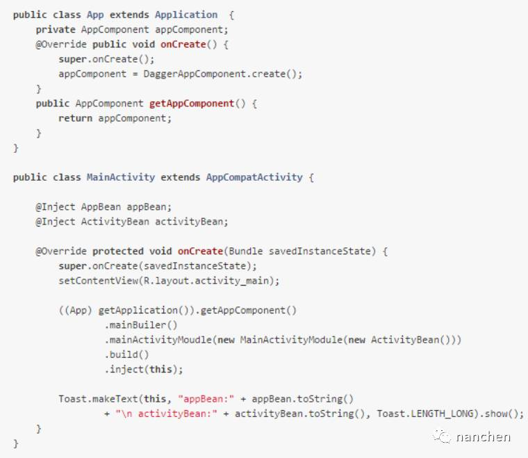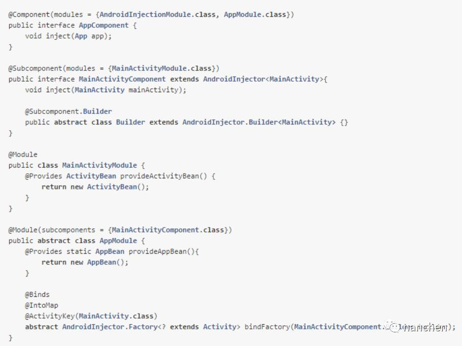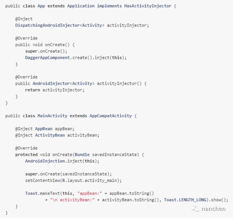 dagger2 已经很完美了吗?谷歌大神们并不满足。因为 android 有许多系统组件,所以以上各种注入方式在 activity 注入的时候需要再去获得 appComponent,十分繁琐;于是谷歌大神们又研究出一套专门用于 android 的注入方式,直接上代码,注意最后的一行代码注入是不是很牛叉: