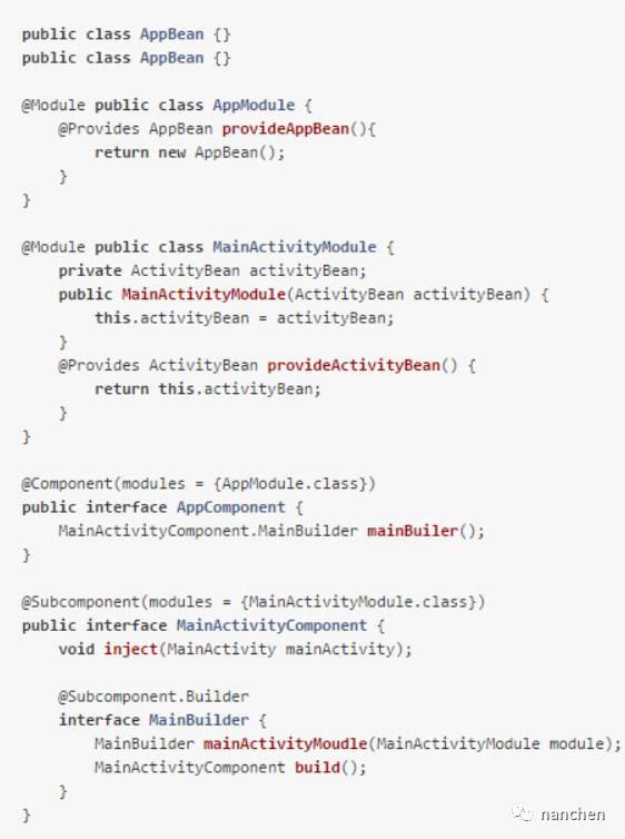1、在子Component,定义一个接口或抽象类(通常定义为xxBuilder),使用 @Subcomponent.Builder 标注: