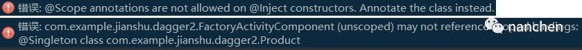 如果使用 @Singleton 标注了构造参数,或者只标注了提供依赖的类而没有标注 Component,在编译的时候分别会报如下两种错误: