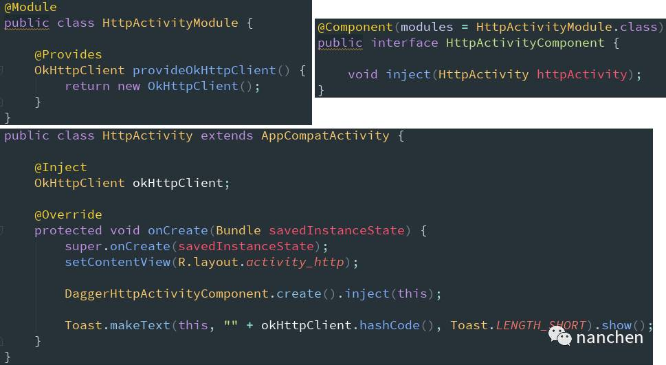 Notice:对比上面闲言碎语里的错误示范,我们发现此处只是多了一个 Component 而已;Component 就是注入者与被注入者之间联系的桥梁,有了它 dagger2 才知道要把谁注入到什么地方,所以它是非常重要且不可缺少的。