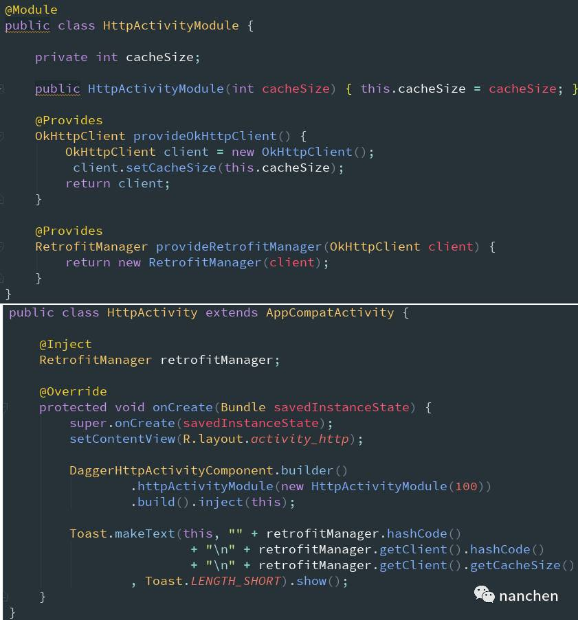 第一步,编写 Module 类并使用 @Module 标注这个类,编写方法返回值为我们需要 inject 的类型并使用 @Provides 标注这个方法;