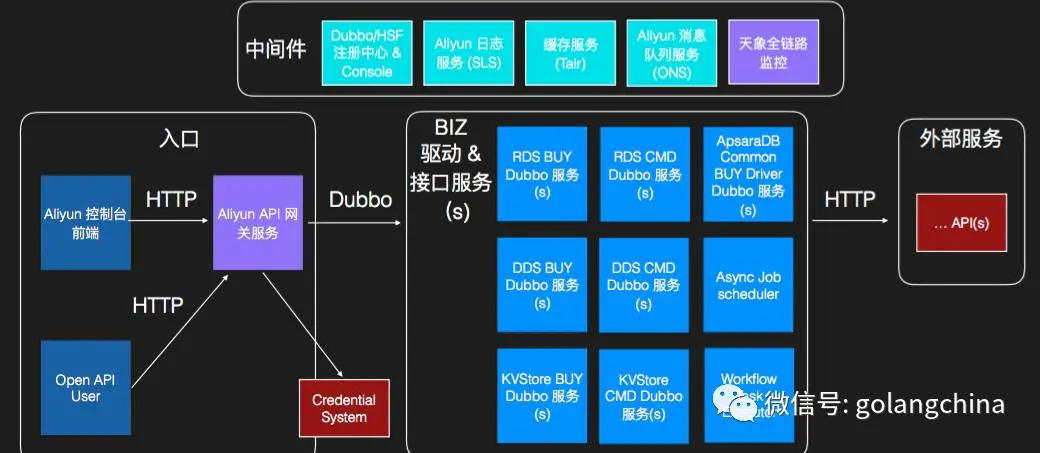 图 2 是目前的前端微服务架构,其中,OpenAPI是前端入口;API网关目前被商业化,由它来调度内部的dubbo服务;其次是最为重要的中间件,由其支撑注册中心、控制台、阿里云日志服务、消息队列服务以及内部的天象全链路监控系统;外部服务主要是进行与其他云产品的交互,比如VPC、VPS等;驱动&接口服务也进一步的开发应用起来。下面着重介绍整个架构中的几个板块。
