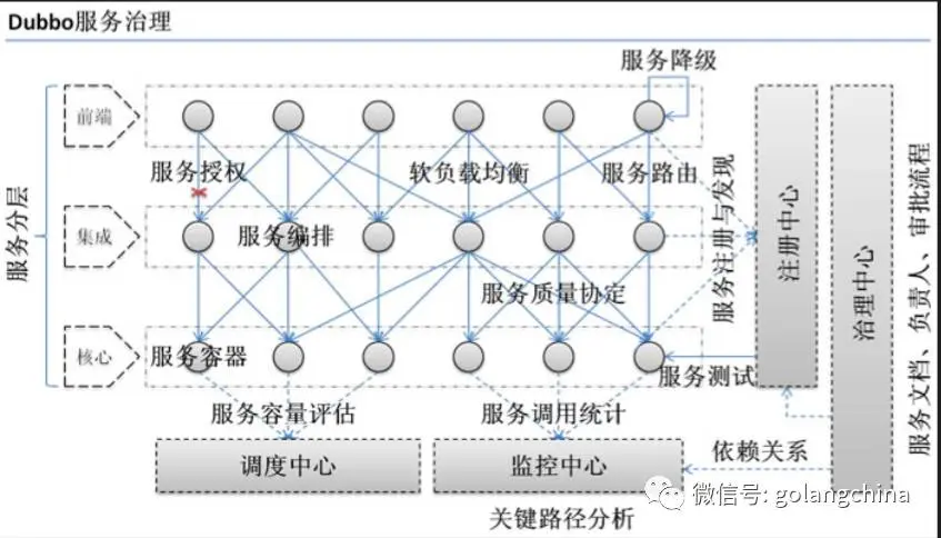 图 6 所示是Dubbo服务治理图。其中包括了调度中心、监控中心、注册中心、治理中心这几项服务,如果要做到100%规范,那么图中的每个点都需要去遵守。因为阿里目前只有几百个节点,所以可以很放心的使用这个框架而不需要担心它有任何的性能问题。
