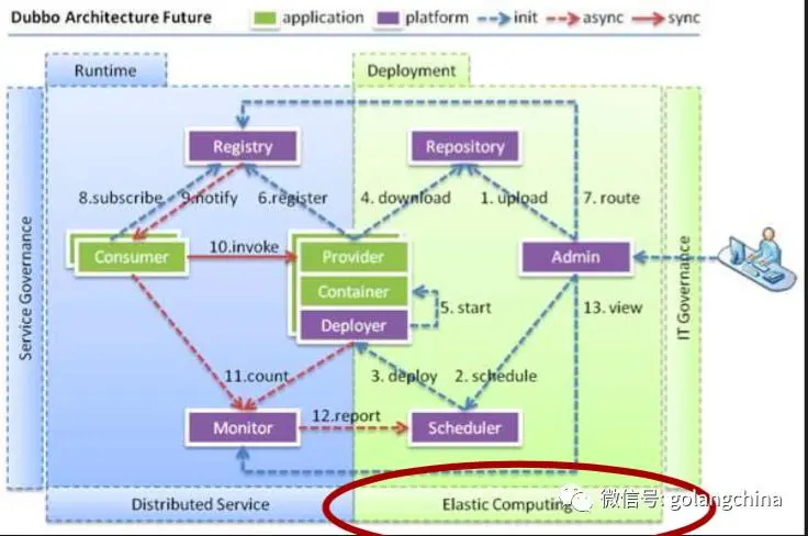 图 7 所示。是讲Dubbo部署到可服务化的一个示意图,当应用起来后会启动 Repository,接下来comsumer便会开始服务了,所有应用都会收到通知,不管新版本、新接口或是新的服务器上线都会接收到通知。此时如果需要调用,便会去寻求最适合的方式;在此之上的Monitor,也会持续回报运维人员。其实关于Dubbo的未来规划,就是可以解决所有SOA的事情,目前还是人工的在执行这件事情,没有施行自动化方案,这也是有遗留的历史因素存在。