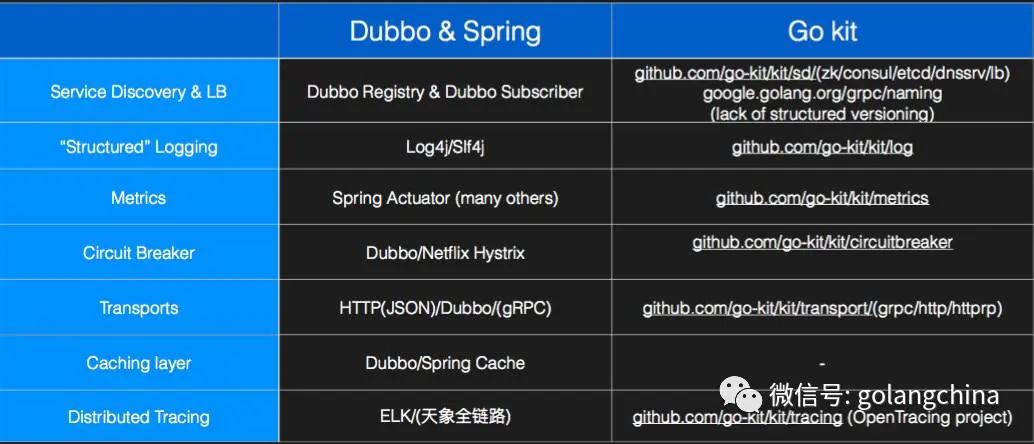 图 9 所示是Go kit与 Dubbo的一些对比,关于Go kit的更详细的内容可以在gokit.io上进行了解。