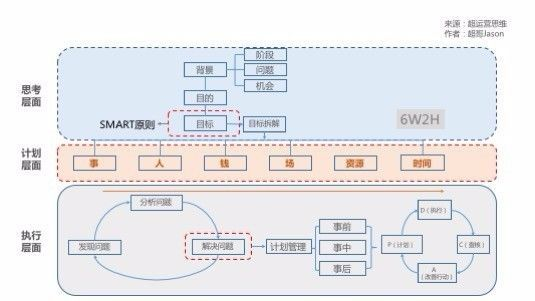 通过对前面的思维体系进行划分,可以分成三个部分:思考层面、计划层面、执行层面。