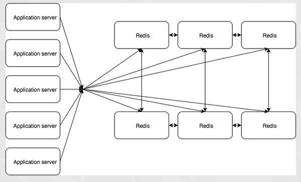 将会有大量的应用服务器与 twemproxy 进行通信,这会将它们的调用路由到合适的 Redis 主节点,twemproxy 将从 sentinal 集群获取主节点的信息,它将控制哪台 Redis 实例是主,哪台是从。这个设置是复杂的,而且仍有单点故障,它依赖于 twemproxy 来处理分片,来连接到正确的 Redis 实例。它具有对应用程序透明的优点,所以我们可以在理论上做到将现有的应用程序转移到这个 Redis 配置,而不用改变应用程序。但是我们要从头开始构建一个应用程序,所以迁移应用程序不是一个必需条件。