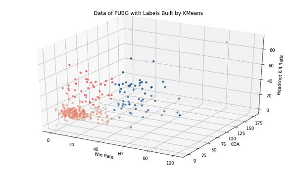 ax.set_title('Data of PUBG with Labels Built by KMeans')