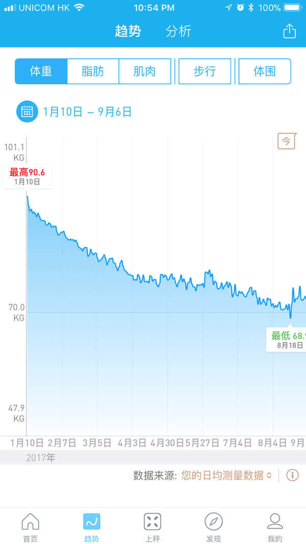我在四、五月曾经在减重上遇到较长时间的平台期,其中一个原因是膝盖疼痛减少了跑步训练量,另一个原因是身体适应了运动量。而在椭圆机和游泳训练后,虽然体重曾降至 70kg 以下,但肌肉量也在下降,所以之后决意加强了阻力训练,令肌肉量提升。现时感觉手臂和腿的肌肉线条也明显了一些,负重量也有满意的进展。