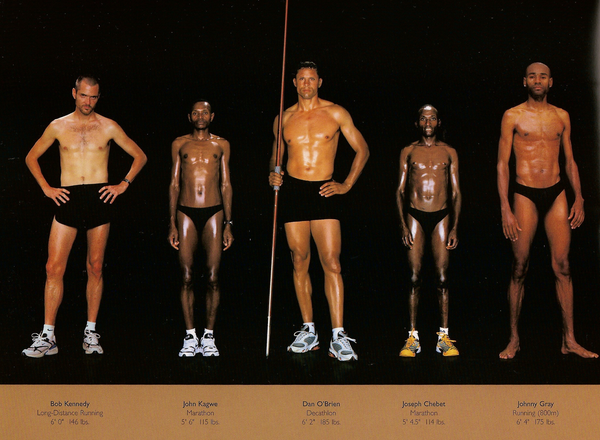 职业运动员会为了获取最好的成绩,把自己的身体优化至最适合该运动项目。在 [1] 里,摄影师 Howard Schatz 拍摄了不同运动项目的顶尖运动员,例如: