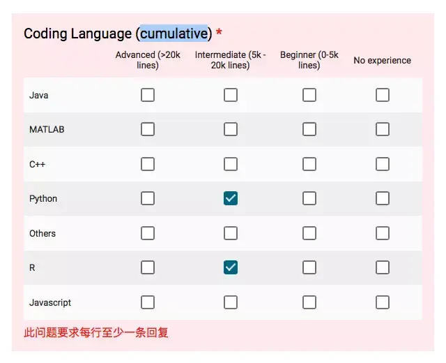 第三页是一些背景调查,吴恩达问本营长是否学生、学历几何、求学在何领域,一一作答不难,比较棘手的一条是编程语言: