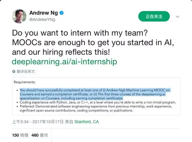 WTF? 吴恩达招实习生!90分钟112人申请!!