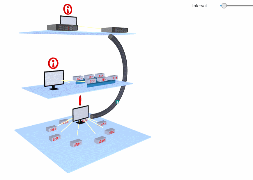 要实现3D界面上展现2d图片,只要按照平常的路走就行,因为ht中的Graph3dView和其他的组件的根部都是div,在div上生成图片用的就是原生js,new Image(),再将image的src和大小赋值,并且加到3d面板上就行了,注意这里是加到3d的底层div上,要用g3d.getView().appendChild来添加,我们还可以看到管线上有虚线流动的痕迹,这是通过不断改变“shape3d.uv.offset”参数实现管道流动的特殊效果,详情请参考 HT for Web 形状手册。