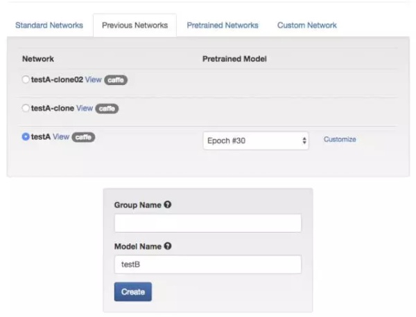 到了创建模型的下半段是选择网络构型,我们选择 LeNet 即可,将模型命名为 TestA。