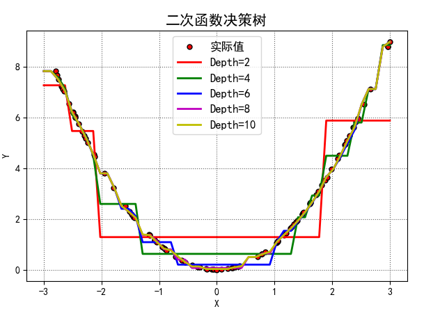 测试数据也是随机数据,但是不同深度的树的模型,产生的预测值也不太一样。如图